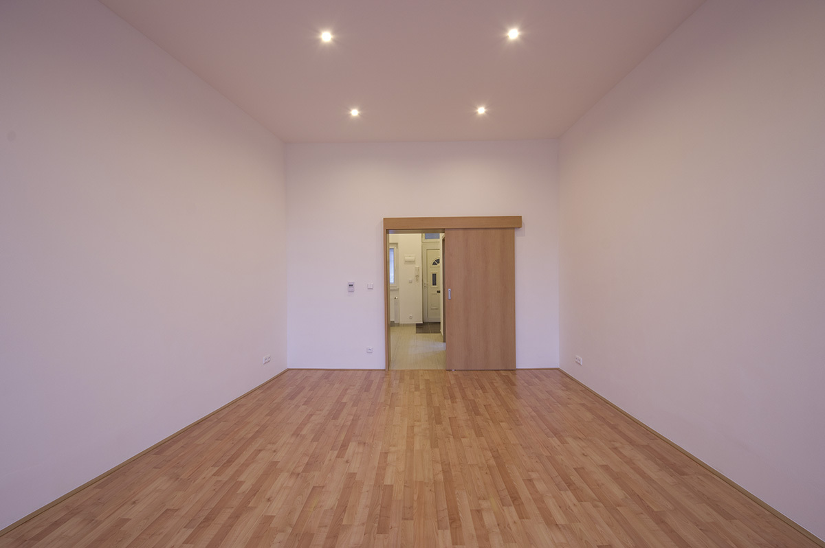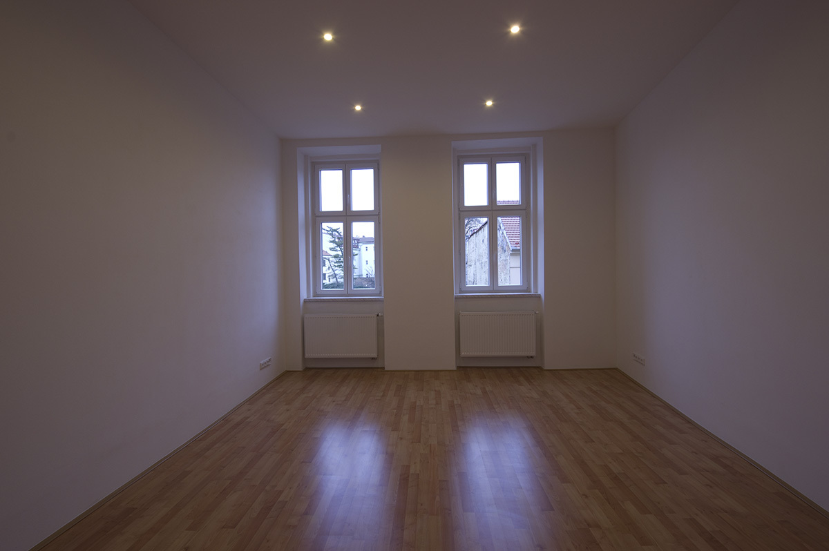 Rozsah prací: celková rekonstrukce bytu 2+1. Vybouraní a pokládka nových podlah, osekání a natažení veškerých omítek, nové rozvody elektřiny, vody, topení a plynu. Sádrokartonové podhledy. Dodávka a montáž zařizovacích předmětů. Výroba a instalace kuchyňské linky.